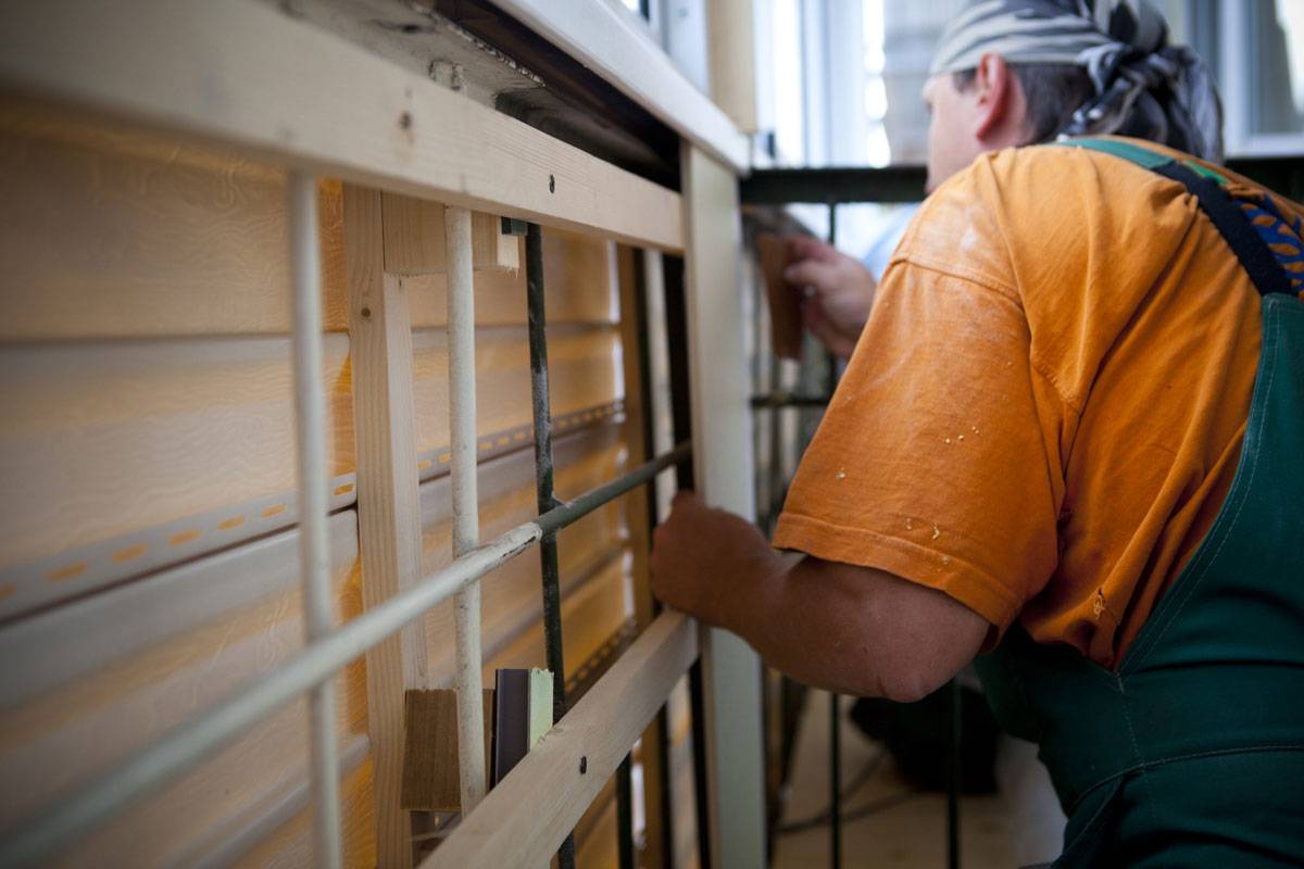 Для выноса применяется необработанный нестроганный брус 50х200х3000 мм естественной влажности из хвойных пород, закрепляемый на старые металлические перила с выносом на улицу. Верхний монтажный шов балкона оставляется увеличенным, чтобы создать более сильный уклон карниза для отвода влаги.